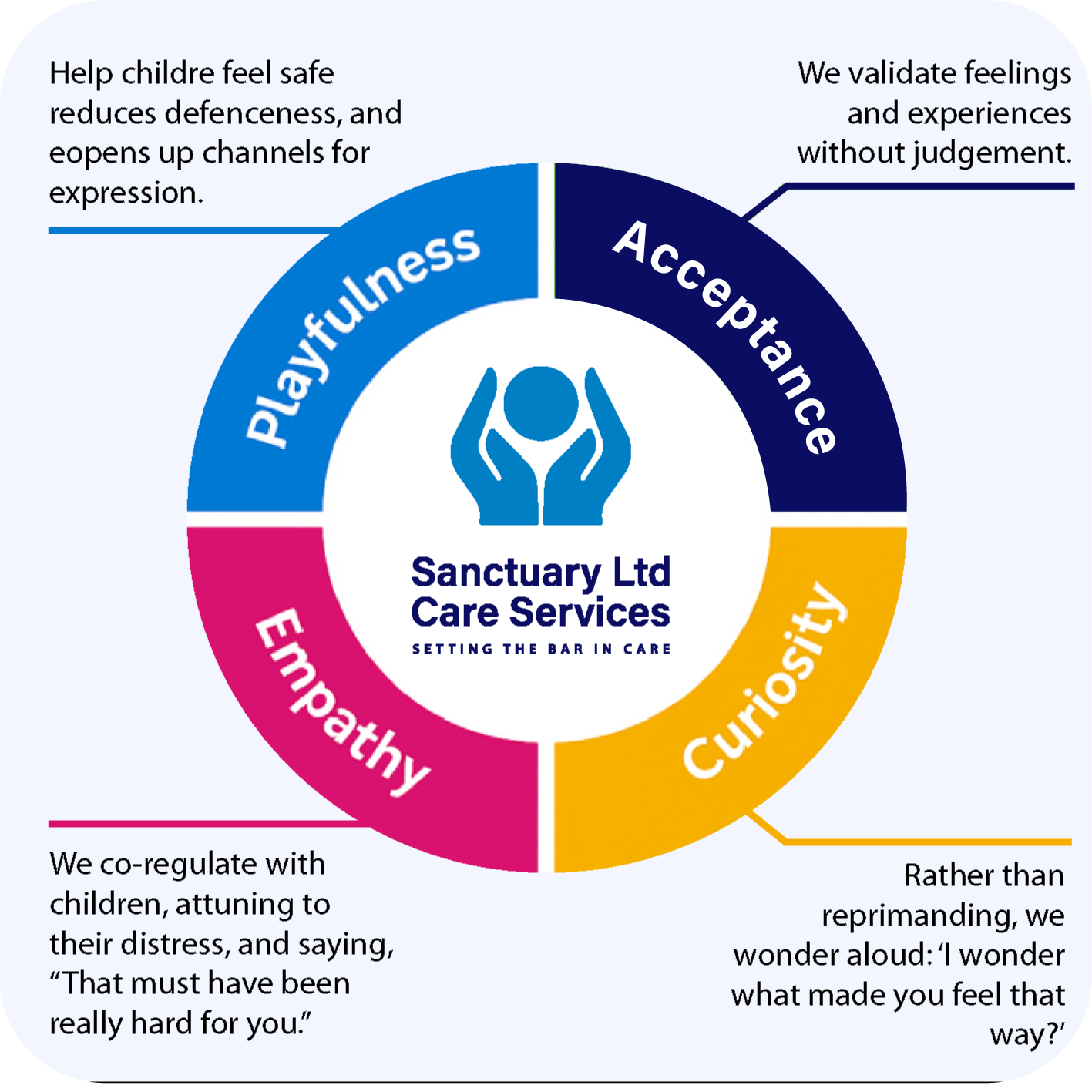 Our staff embed the PACE model, created by Dr. Dan Hughes, into every interaction with young people. This approach promotes connection over correction and helps young people to feel safe enough to explore, trust, and grow.
